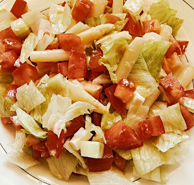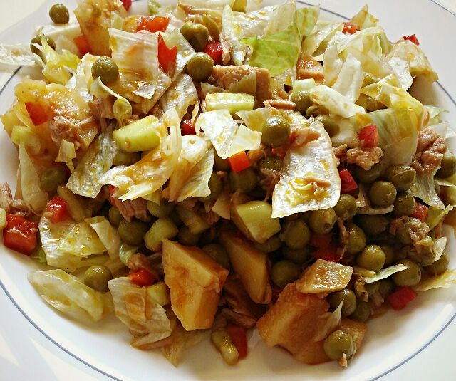 Patata cocida, guisantes, lechuga, tomate, pepinoLechuga, Champion, Aceite y LimónTomate, Pepino, Queso, EsparragosTomate, Piña y LechugaEnsalada con yogurt y zumo de limon, lechuga, tomate, pepino … y lo que queraisNaranja, Champiñon PortoBello y Champiñon Dorado